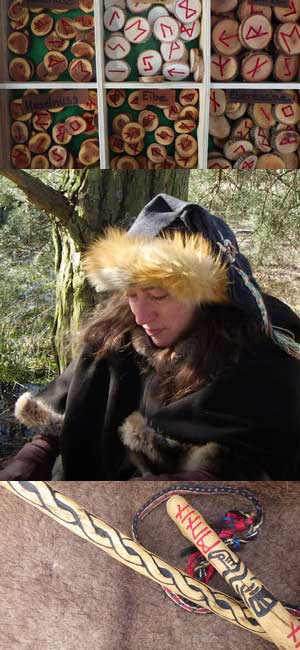 Ich stelle Runenfutharks, Amulette und Runenstäbe her. Dabei verwende ich die heimischen Hölzer Eibe, Birke, Haselnuss, Holunder und Eberesche.
