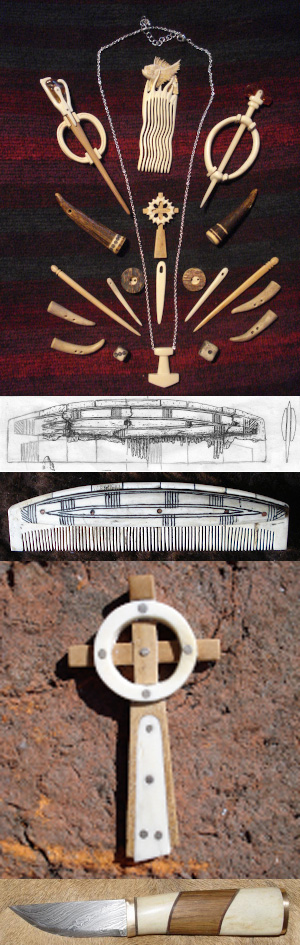 Ich fertige Nachbildungen von historisch belegten Gebrauchs- und Schmuckgegenständen aus Knochen und Geweih, so wie z.B. Nadeln, Pfeilspitzen, Harpunen, Fibeln, Kämme, Schmuckanhänger und Messergriffe über einen Geschichtszeitraum von der späten Jungsteinzeit bis in die Neuzeit bis Mitte des 20. JHNC, sowie eigene Arbeiten, welche sich an historischen Vorbildern orientieren.